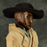 The entire set is created around a folk-art carving by artist Matt Fennewald, who used a mix of woods – including pecan, walnut, and cherry – to assemble the body of the sculpture, which is scaled to the size of a young frontiersman. Affectionately nicknamed “Wilbur” by his creator, the carving was given a hand-rubbed finish of wax, tar, and shellac.